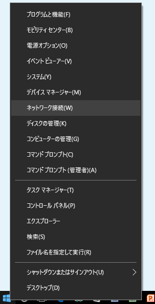 コマンドプロンプトを実行する時と同じ要領で、「ネットワーク接続」を選択します。