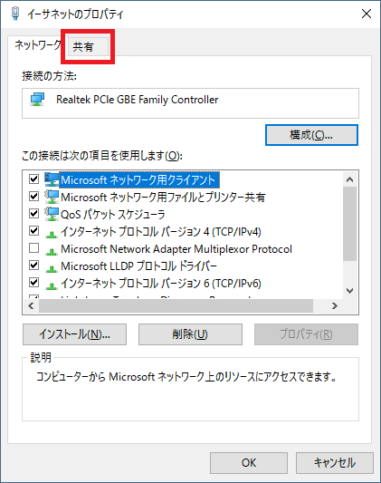 プロパティを開くと、上のような画面が開きますので、共有タブをクリックします。