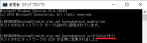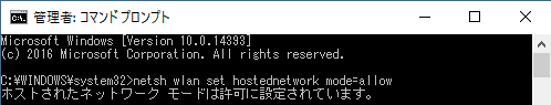 コマンドプロンプトが立ち上がったら、「netsh wlan set hostednetwork mode=allow」と入力します。