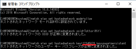 パスワードの設定:netsh wlan set hostednetwork key=●●●● keyusage=persistent