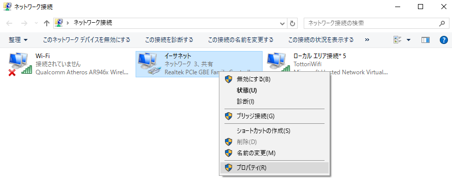 今回、有線でネットに接続しているので、「イーサネット」のプロパティを開きます。