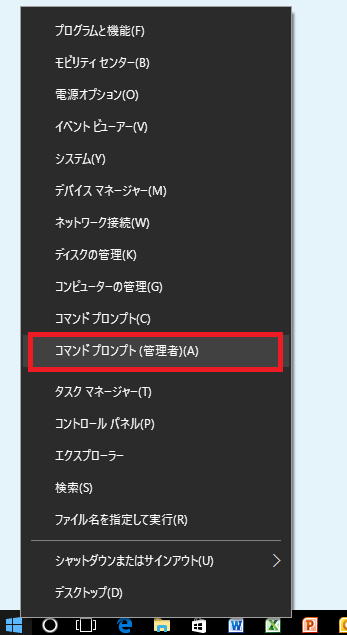 Windowsのマークを右クリック(もしくはWindowsキー+Xキー)で左下からメニューが現れるので、「コマンドプロンプト(管理者)」を実行します。