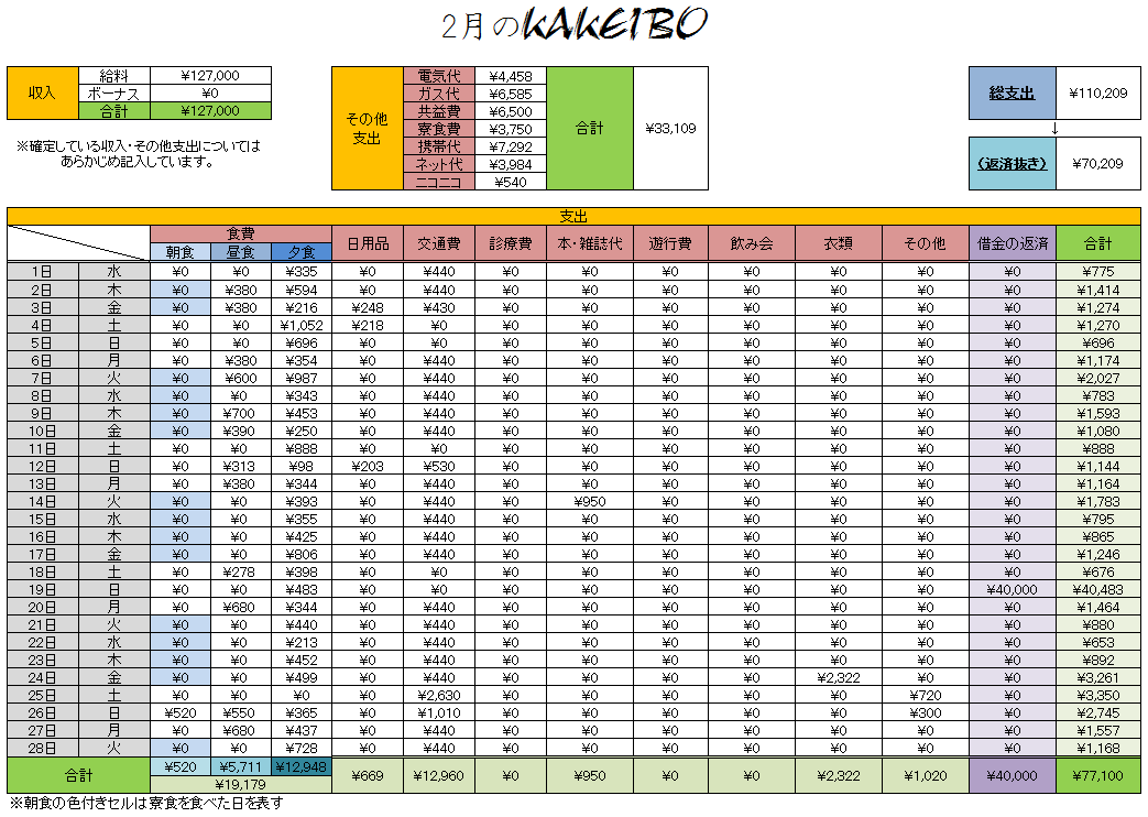 ただ2月は、3食キッチリ食べた日がちらほらあったので、その分食費がかさんでしまったようです。