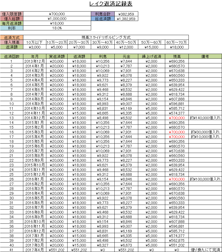 レイクの返済表