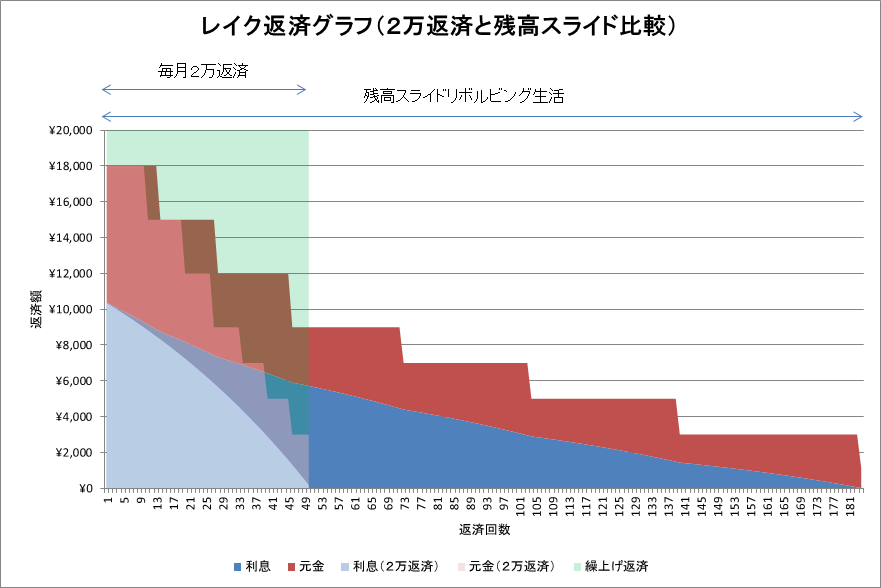 2万円返済と残高スライドリボルビング生活の比較