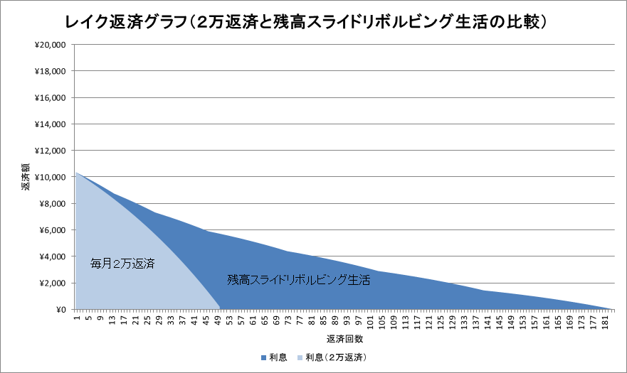 ですが、残高スライドリボルビング生活と比べると、半分の返済回数で済みます。
