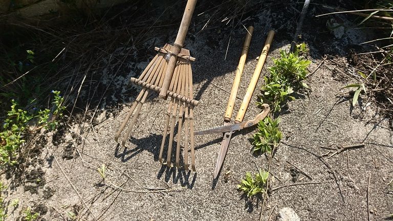 イカれた熊手と、イカれたノコギリと、イカれた・・・これ「刈りこみバサミ」っていうみたいです。